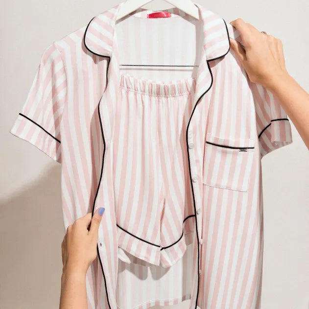 Pijama Beverly Hills by Mon, produto para mulheres que buscam estilo, conforto e beleza ao mesmo tempo, possuindo uma estetica rosa exclusivo de toda paryzinha esse pijama ele possui uma malha fria que esfria o corpo onde causa uma sensação de leveza no cliente, além disso destaca sua praticidade Produto exclusivo ideal da Charmontie.